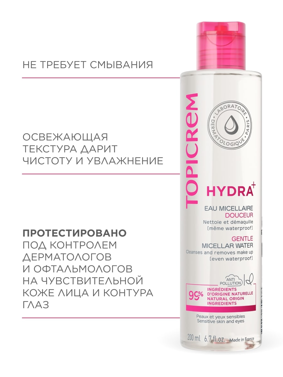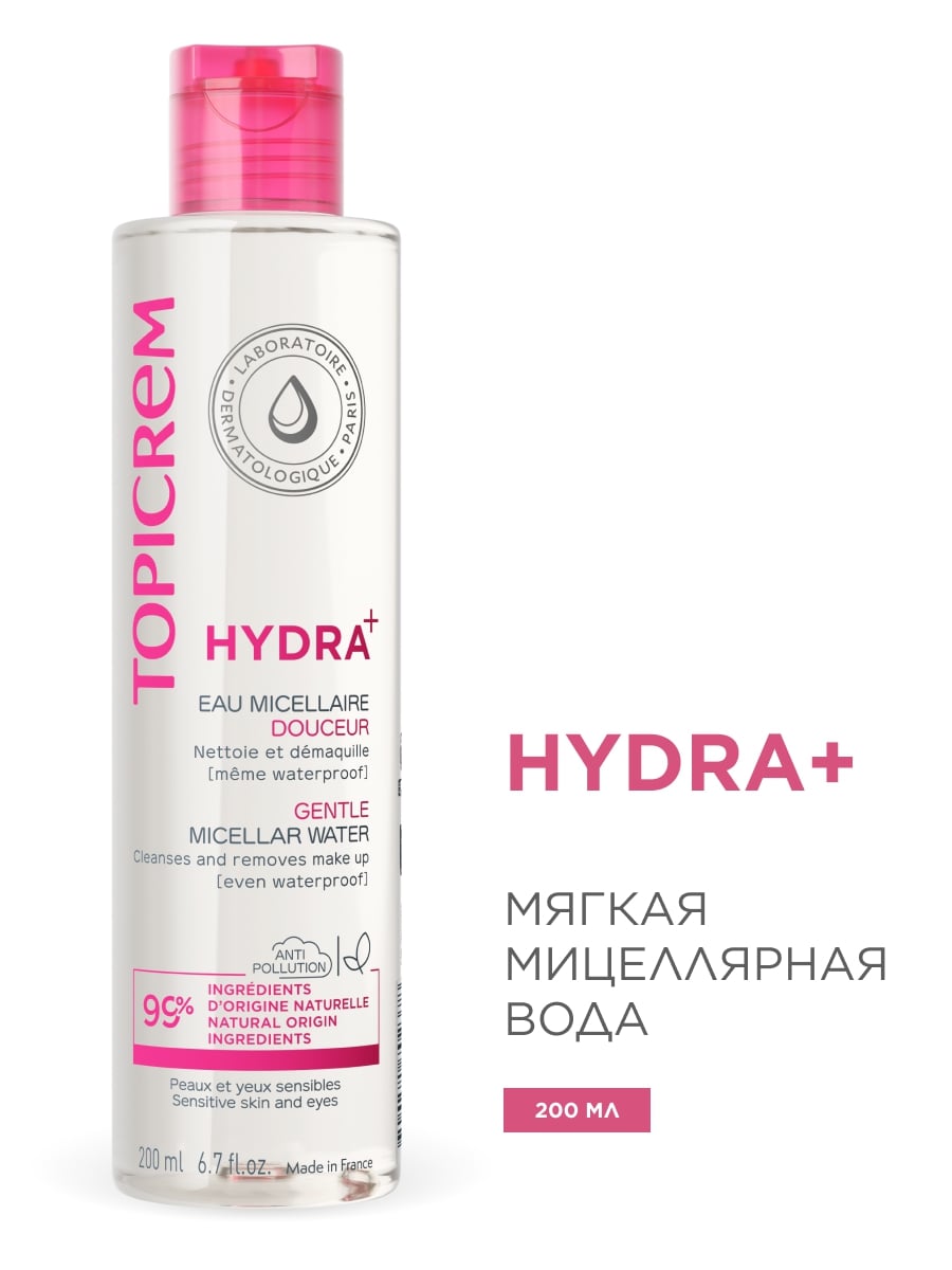 HYDRA+ Мягкая мицеллярная вода содержит мицеллы растительного происхождения, которые деликатно очищают кожу и удаляют макияж, в том числе водостойкий, а также загрязнения окружающей среды.
