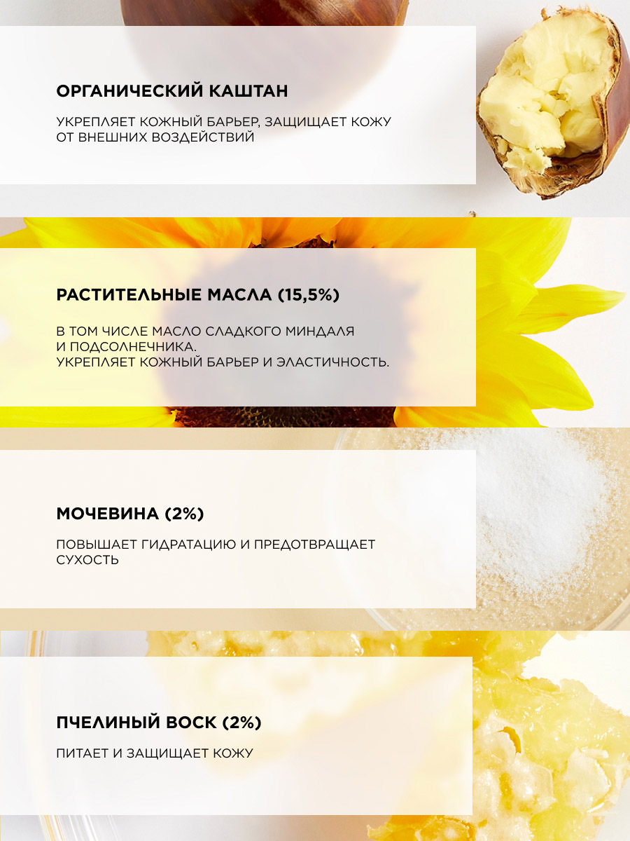 AQUA (WATER), GLYCERIN, PRUNUS AMYGDALUS DULCIS (SWEET ALMOND) OIL, HELIANTHUS ANNUUS (SUNFLOWER) SEED OIL, COCO-CAPRYLATE/CAPRATE, CERA ALBA (BEESWAX), UREA, PALMITIC ACID, STEARIC ACID, GLYCERYL STEARATE, PEG-100 STEARATE, 1,2-HEXANEDIOL, BUTYROSPERMUM PARKII (SHEA) BUTTER, HYDROXYETHYL ACRYLATE/SODIUM ACRYLOYLDIMETHYL TAURATE COPOLYMER, PARFUM (FRAGRANCE), DISODIUM CETEARYL SULFOSUCCINATE, XANTHAN GUM, CAPRYLYL GLYCOL, CHLORPHENESIN, TOCOPHEROL, MALTODEXTRIN, SORBITAN ISOSTEARATE, CASTANEA SATIVA (CHESTNUT) SEED EXTRACT, SODIUM HYDROXIDE